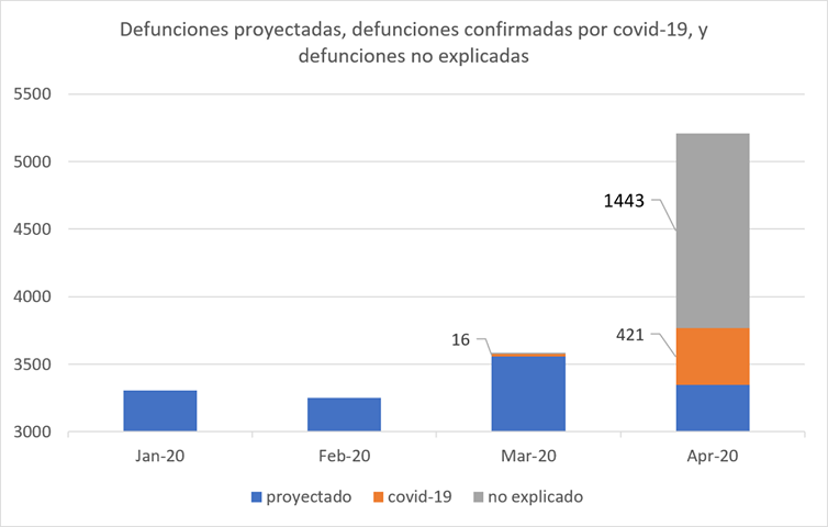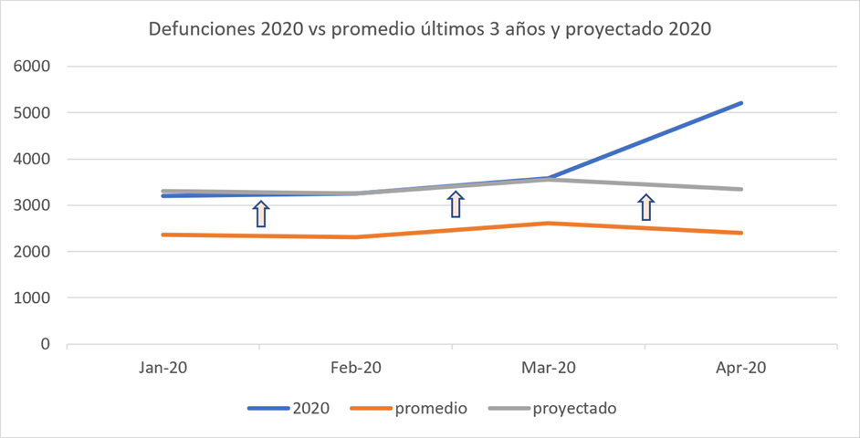 Este último breve análisis de cierre no tiene la menor intención de atribuir las más de 1440 defunciones al COVID-19. Como hemos visto en las primeras secciones del presente artículo, determinar la cantidad exacta de decesos por COVID-19 no es una tarea sencilla y será tarea de los epidemiólogos y personal médico a cargo de la revisión de los diagnósticos la confirmación o no totales de estas cifras. Tampoco busca ser un argumento respecto a un ocultamiento intencionado de información, dado que como también hemos señalado en las primeras secciones, el diagnóstico médico es un fenómeno complejo y más aún en contexto de una pandemia derivada de una nueva enfermedad como es actualmente el caso, además que la metodología estandarizada internacionalmente en los reportes de cada país corresponde a la cantidad de fallecidos a los que se ha confirmado su deceso por COVID-19. Sin embargo, sí consideramos válida esta aproximación para poder mostrar a la ciudadanía que hay un incremento vertiginoso en la cantidad de decesos que no es explicado ni por las tendencias vistas en años anteriores ni por las cifras oficiales de decesos por esta enfermedad, y que de eventualmente se confirmarse son producto de esta lamentable enfermedad, implicaría que la cantidad real de fallecidos por COVID-19 del mes de abril podría ser hasta 4.4 veces que aquella reportada al cierre del mes según las cifras oficiales de casos confirmados para el mismo periodo.