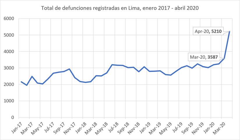 Esta segunda forma de análisis también puede ser aplicada para el caso de Lima. Por ejemplo, si evaluamos el Sistema Informático Nacional de Defunciones (SINADEF), el cual nos da total de defunciones registradas mensualmente en Lima, puede observarse un notable salto de fallecidos entre marzo y abril del presente año.
